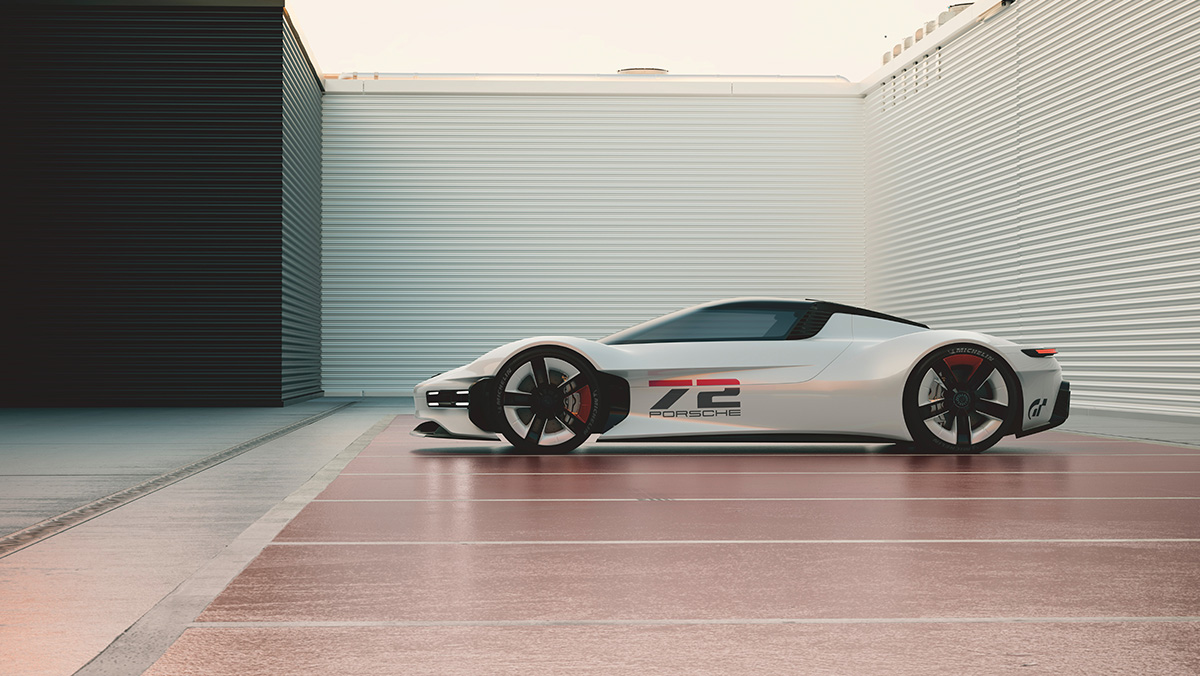 The Porsche Vision Gran Turismo showcases the futuristic concept car designed exclusively for Gran Turismo 7. Focusing on its sleek contours and bold presence, this CGI series embodies the purity of Porsche's forward-thinking design through minimalistic visuals and dynamic animation.